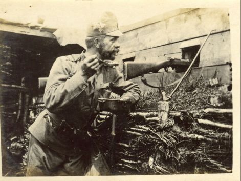 Megfigyelő állásban. A katona kezében 1888M Mannlicher puska van. A kép vélhetőleg a háború korai szakaszában készült.